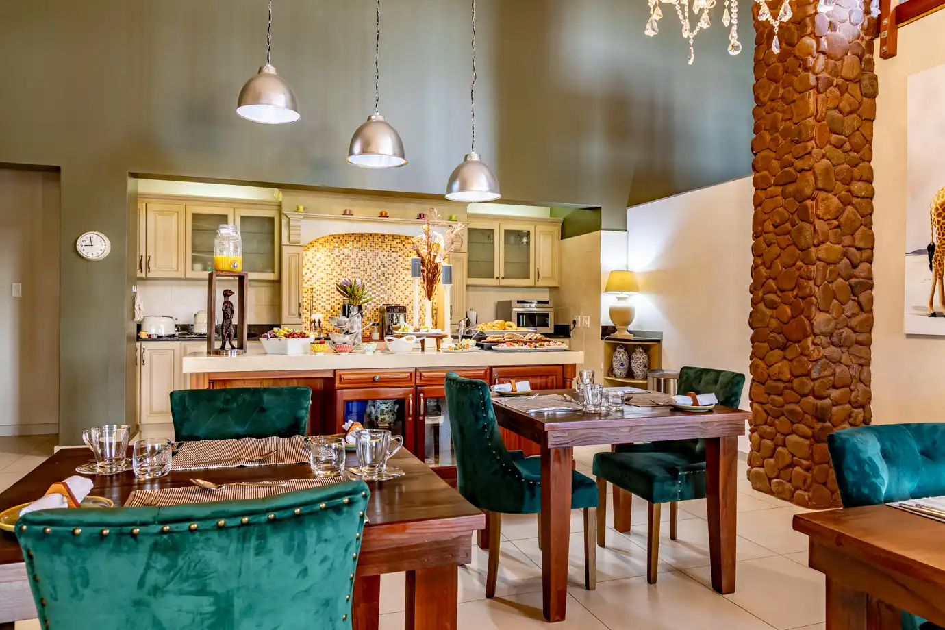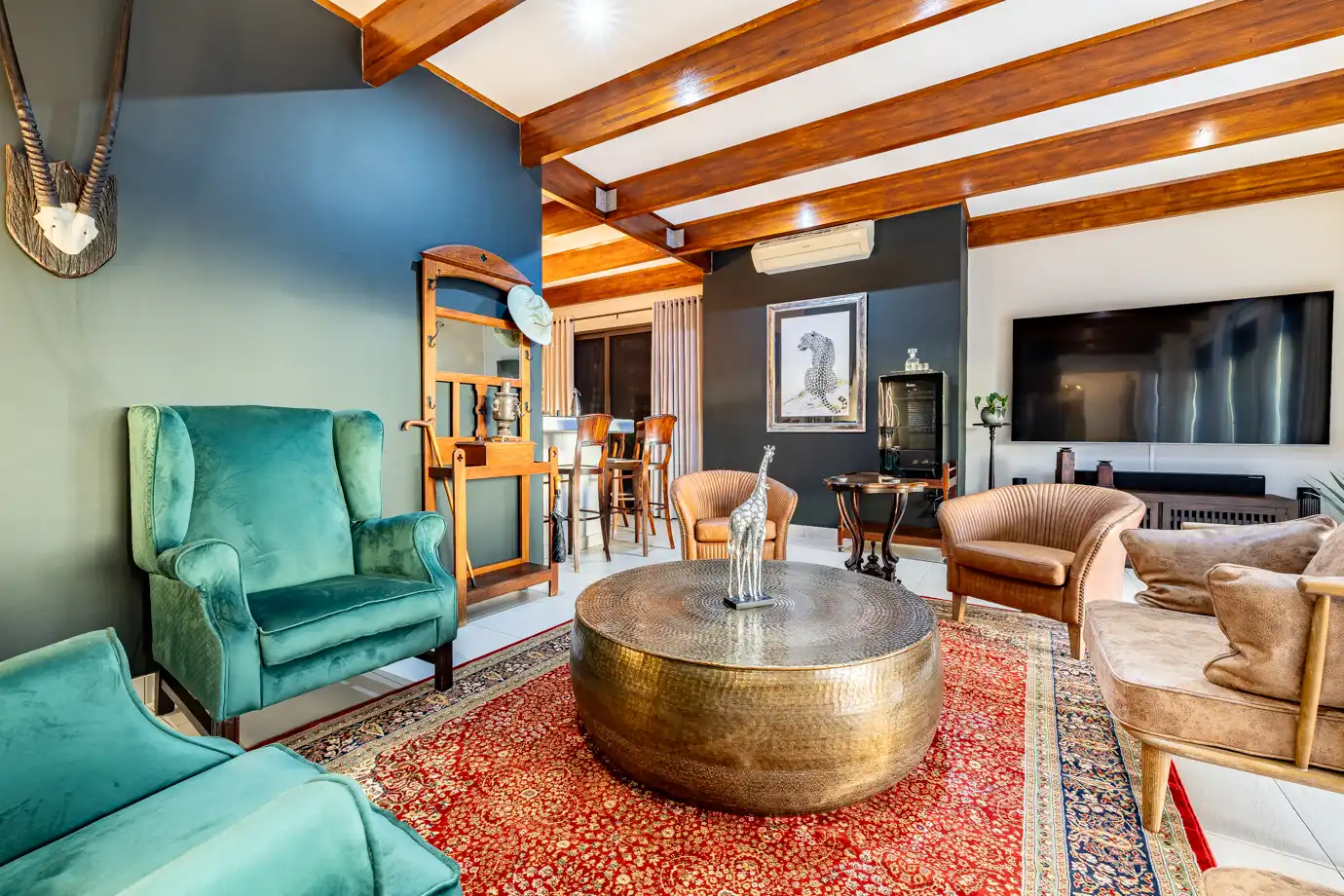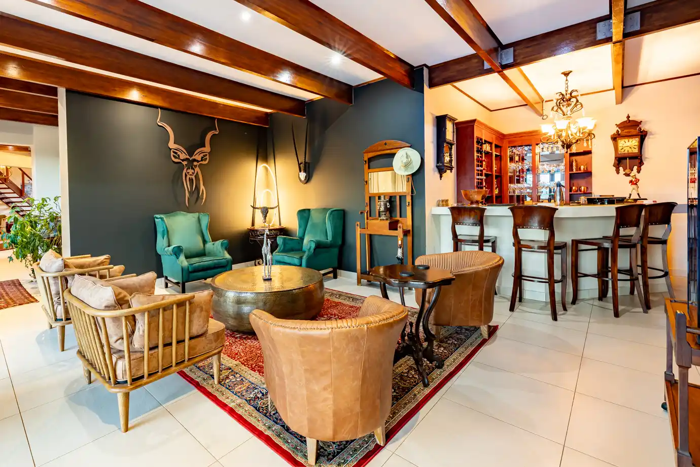 The main lounge is located in the centre of the house. A beautifully furnished elegant lounge where one can relax and read a book or gather together before venturing out on a safari or excursion.