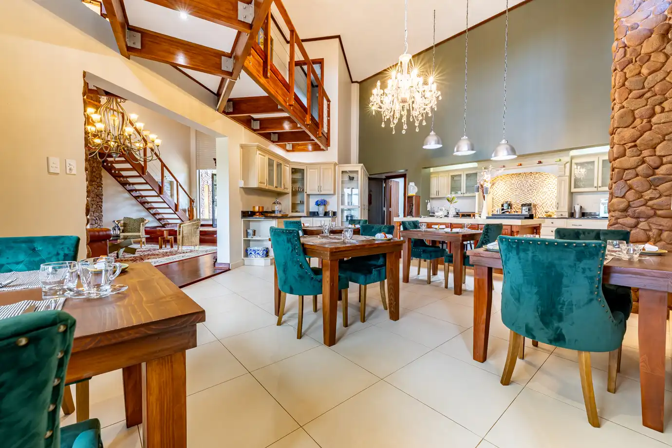 The beautifully furnished dining room has individual 4 seater tables that can easily be joined to form on large dining experience